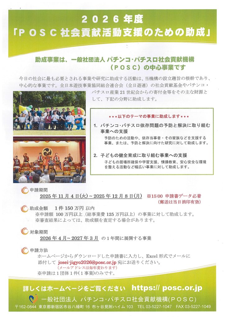 パチンコ・パチ社会貢献機構(POSC)による助成事業のお知らせです。